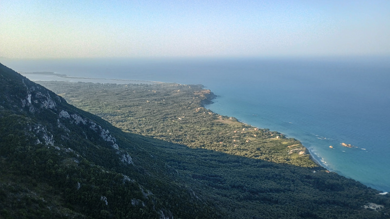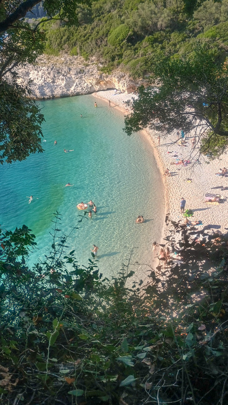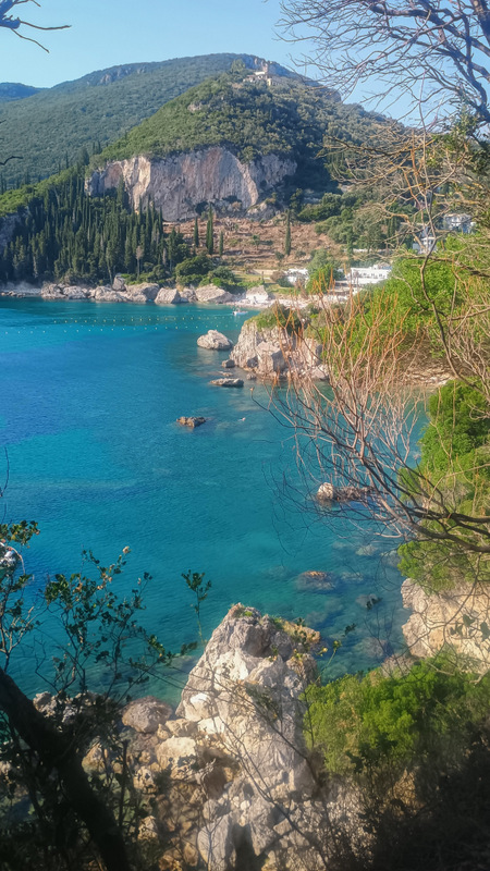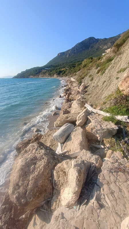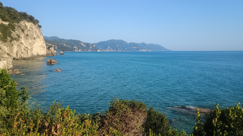 Fac o plimbare să văd ce mai e pe aici și dau de un stîlp cu marcaj de Corfu Trail. Văd și poteca și urc pe ea. Ei bine am fost foarte inspirat. După cîteva minute de mers abrupt ajung pe stînca de deasupra plajei. Culorile, plaja, arată magnific. În plus e și umbră. Mai merg o bucată și dau iarăși de o surpriză: fără vreun avertisment ajunge lîngă un avem cam de 20 de metri. Jos e apă. Mai merg un pic, ies din pădure și mă bucur de peisajul cu stîncile și munții de la Paleokastritsa. A fost absolut spectaculos.