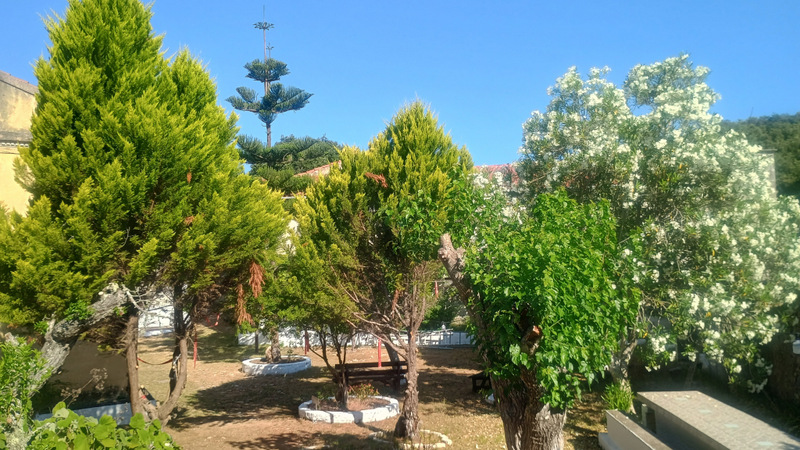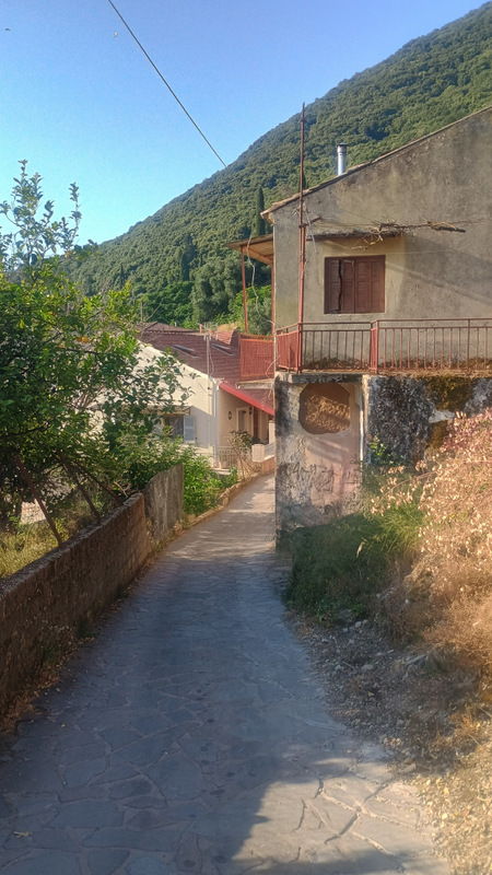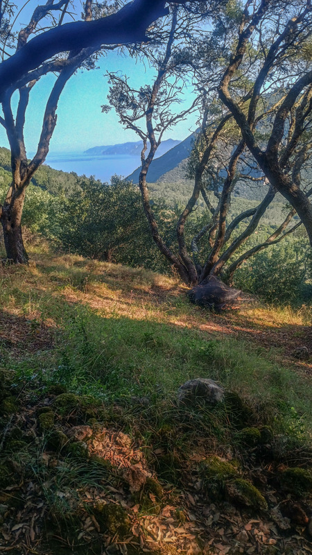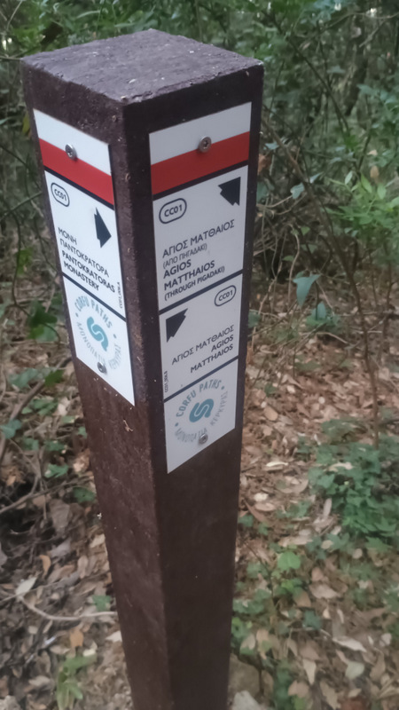 Mă trezesc de dimineață. Maria zice că vrea să urce și ea. Ne echipăm rapid, luăm cu noi 3 litri de apă și plecăm la deal. Atmosfera e încă plăcută, e răcoare. Găsim repede marcajele Corfu Trail. Mai urcăm prin oraș, pe drum de ciment cîteva serpentine abrupte. Apoi intrăm în pădure. La început mergem printre măslini. Se aud tot felul de zgomote, tot felul de animăluțe își fac de lucru.