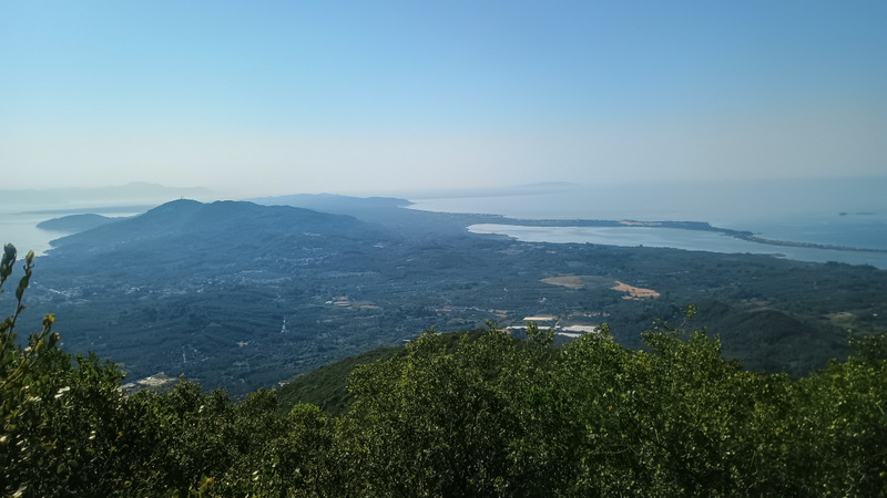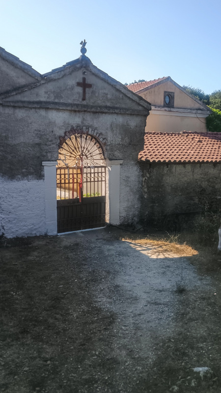 Chiar lîngă mănăstire un șarpe destul de gros ne simte și într-o clipă se face nevăzut. Ocolim zidurile și mergem spre locul cel mai înalt. Acolo este amenajat un punct de belvedere cu balconaș și o bancă veche și ruptă. Iar priveliștea..e copleșitoare. Suntem cam la 400m deasupra mării într-un loc abrupt. E extraordinar. Se văd o bună parte din extremitatea vestică a insulei și lacul Korission.