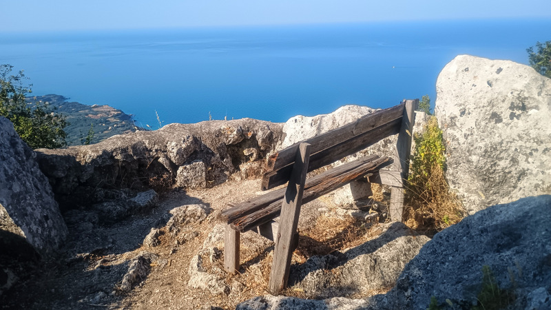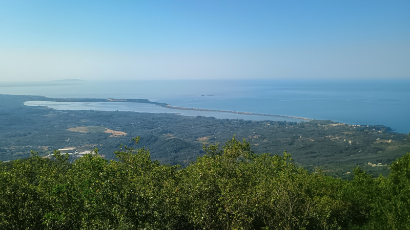 În apropiere mai sunt două puncte de belvedere. Dar pînă la ele este de mers maxim 5-10 minute. Poteca ne poartă prin pădure și ne duce la niște ruine. Le ocolim prin stînga , coborîm puțin și ajungem la primul punct de belvedere. Acesta este orientat spre est. De aici se vede fain satul Agios Matheos, marea și dinspre este și dinspre vest, munții. Copleșitor și peisajul de aici.
