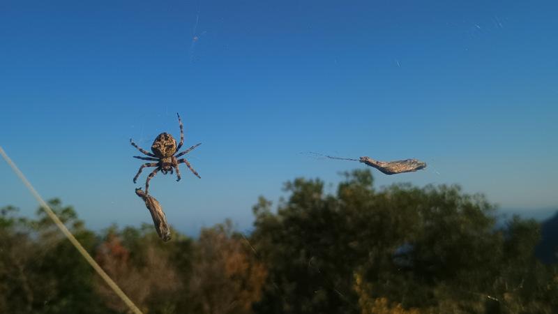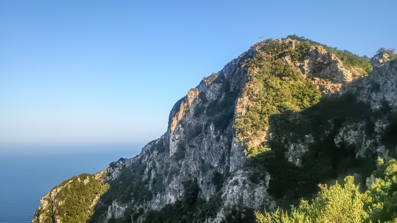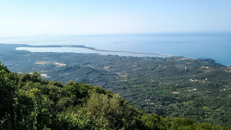 Crucea de lemn este ancorată în niște frînghii. Păianjeni uriași și-au țesut multe pînze pe aici. Locul oferă o panoramă de 360 de grade. Deși nu sunt la mare altitudine, în jur de 400 de metri, se vede o mare parte din insulă: de la extremitatea de sud, pînă la plajele și munții Paleokastritsei și pînă la Vîrful Pantokrator, 998m, cel mai înalt din Corfu. Satu vreo 10 minute și mă bucur de peisaj.
