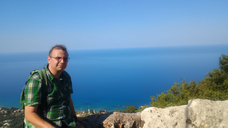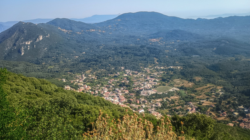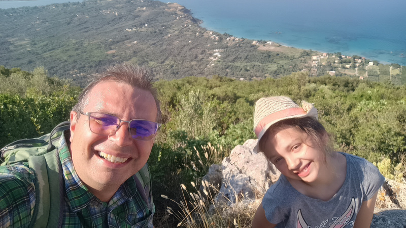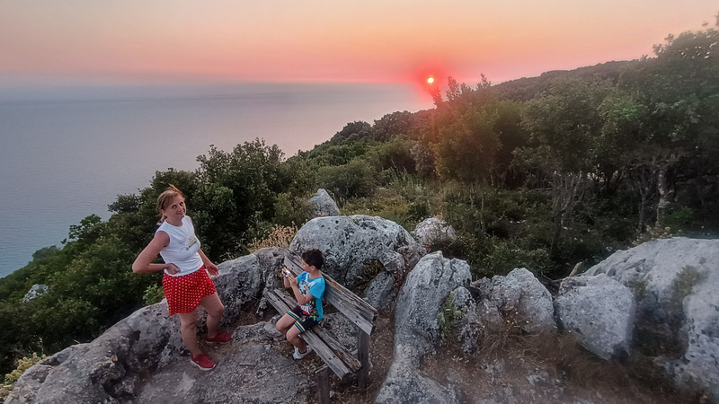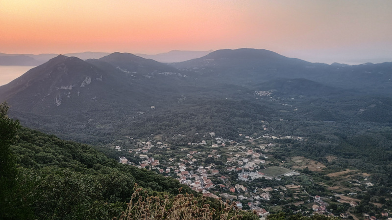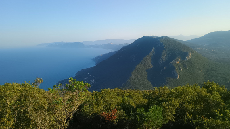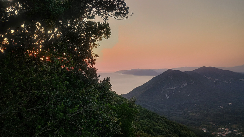 Revenim la locul de cazare și ne echipăm de drumeție. Calculăm plecarea astfel încît să ajungem la cele două locuri de belvedere cam cu o jumătate de oră înainte de apus. Intrăm iarăși pe Corfu Trail și ieșim din sat, continuăm pe potecă pînă la intrarea pe drumul forestier. Acolo ne întîlnim cu o mașină care coboară.