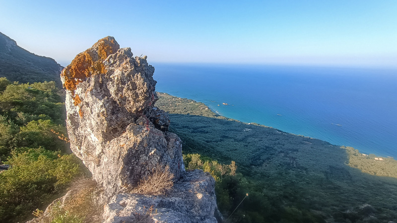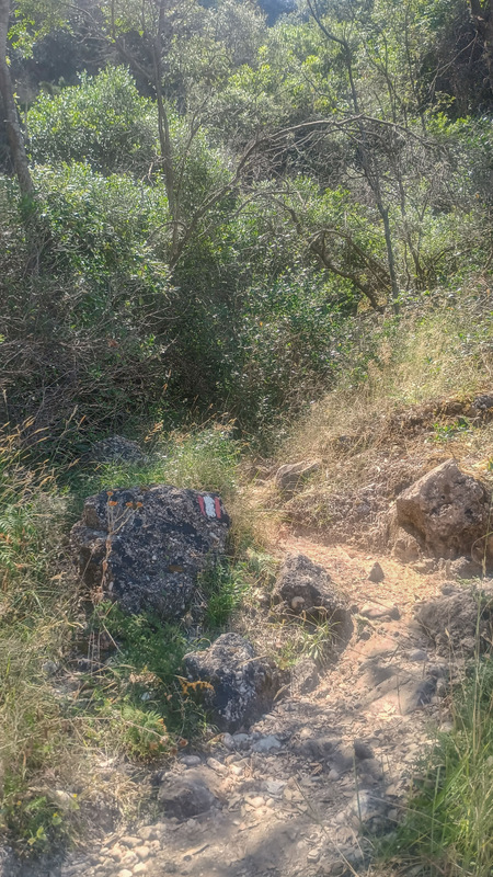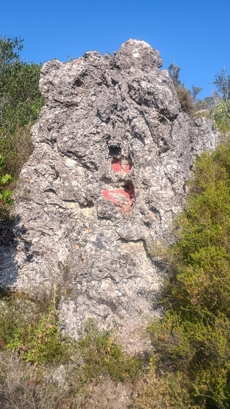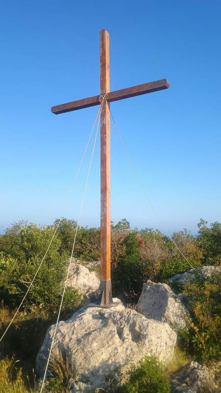 Urcăm mereu dar ușor fără a face prea mare efort. Undeva spre dreapta se face o potecă iar pe o piatră este pictat semnul literei X. Adică, nu se merge pe aici. Hm..poteca asta pare a duce totuși la un loc frumos. Și o încercăm. Într-un minut ajungem la un loc de belvedere superb aflat deasupra mării. Spre nord este o stîncă mare cu o cruce în vîrf. Așadar aici duce poteca de la răscruce.
