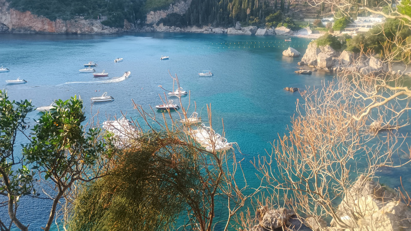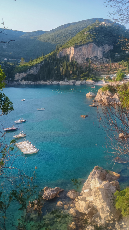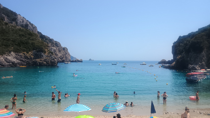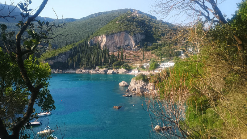 Spre după-amiază plecăm spre Paleokastritsa. Drumul e ceva mai lat, virajat. Parcăm în zona plajei principale a orașului. Revedem cu plăcere locurile acestea, în anul 2019, la precedenta vizită am petrecut mai mult timp în această frumoasă stațiune dar și în împrejurimile ei.