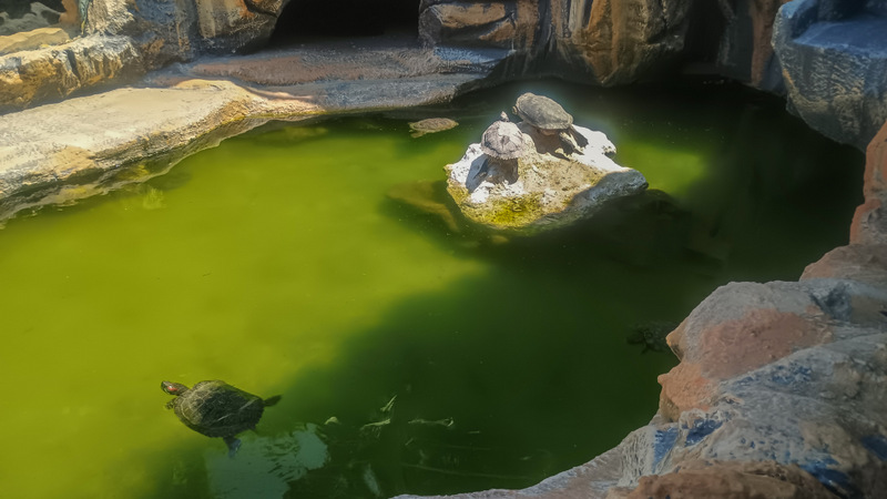 Mergem la acvariu. Trebuie să așteptăm cîteva minute pînă cînd vom fi preluați de un ghid. Timpul îl folosim ca să admirăm niște broaște țestoase micuțe care se află într-un bazin exterior.