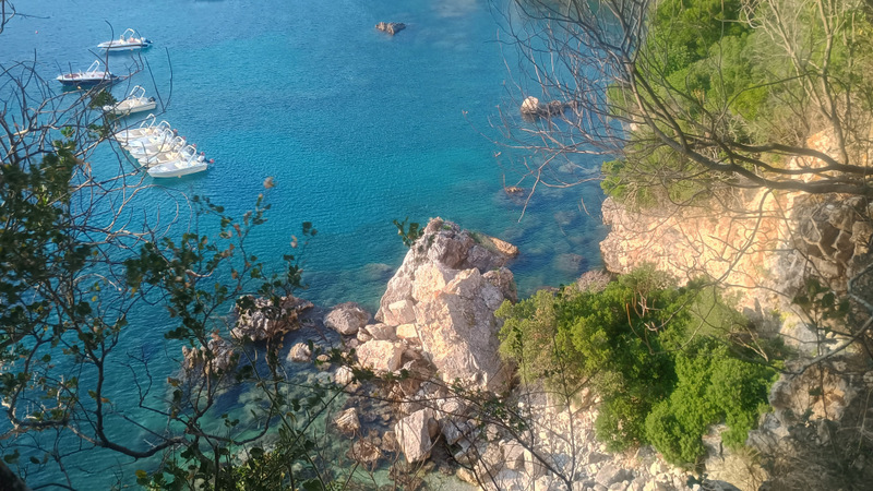 Revin pe plajă și sunt curios pe unde continuă poteca. Și constat că nu am fost atent. Urc iară treptele pe care am venit la plajă. Undeva găsesc o potecă ce mă duce la un nou punct de belvedere către Liapades. Apoi observ o cale de acces care mă scoate din pădurice pe cealaltă stîncă ce străjuiește Plaja Rovinia. Urmează alte clipe de încîntare și exaltare.