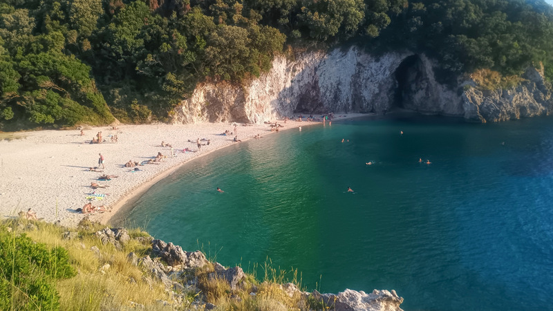 Ajungem la plaja Rovinia. Care este absolut spectaculoasă și superbă. Este mărginită de două stînci mari la cele două capete, are ape azurii, o mică grotă și o porțiune cu umbră. E locul perfect de relaxare după o zi atît de plină și de caldă.