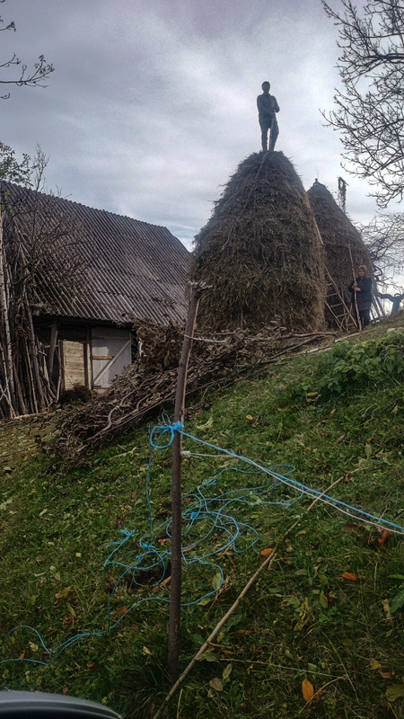 Stăm pe vîrf o vreme, copiii ar mai lenevi, dar vine și vremea să coborîm. Alegem același traseu, renunțăm la a mai face circuitul. Întoarcerea la mașină este insolită. Săteanul cel amabil era în cocoțat în vîrful furciturii și tot primea fîn cu furca de la soția sa. Apoi îl călca de jur-împrejurul rudei.