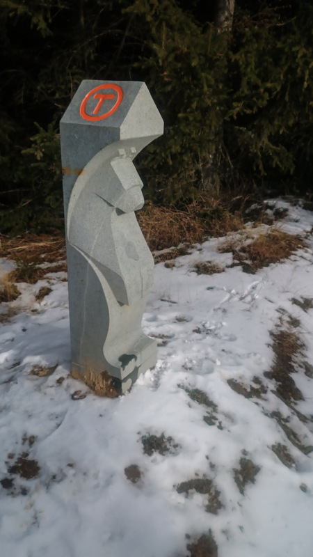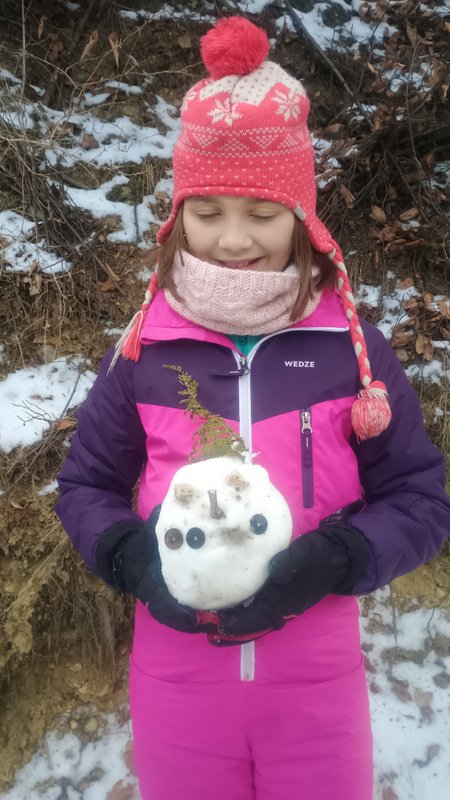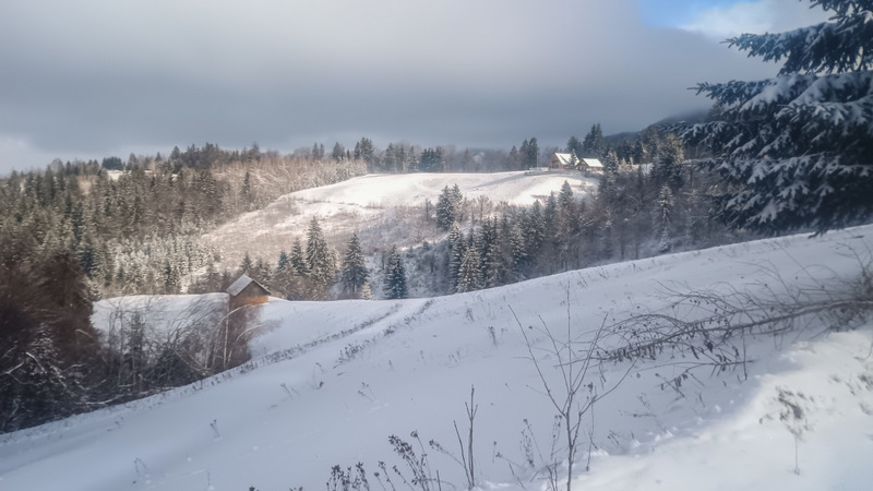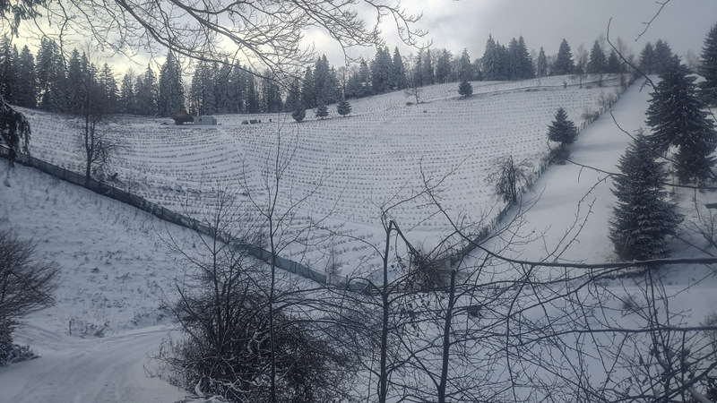 Aproape este și prima bornă din traseul de azi. Pe drum e zăpadă, numai bună de sanie. Nici nu îmi termin bine gîndul că de undeva de sus apar cîțiva copii pe sănii. Eheii..ce mi-ar mai place și mie.