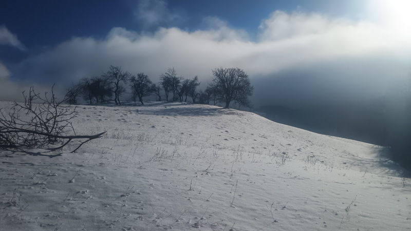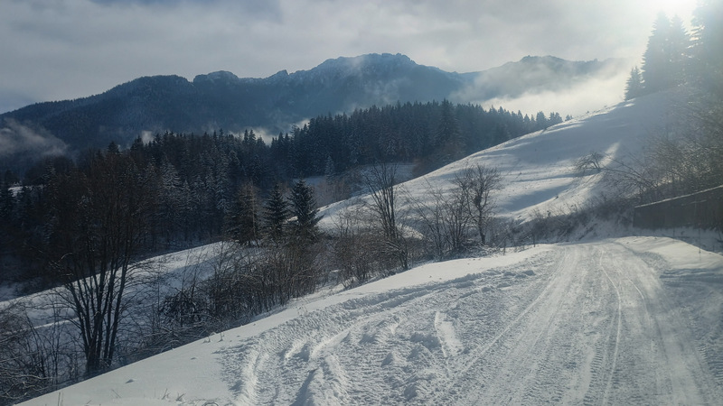 Am plecat din Bran pe Valea Porții. Marcajul merge cam pînă la jumătatea văii, apoi, după Căminul Cultural începe să urce în stînga, pe strada Vîrful Omu. E zăpadă, uneori e alunecos dar pe măsură ce urci peisajul se deschide iar peisajele arată spectaculos. Nu am prins chiar o zi extraordinară, dar a fost vizibilitate și ne-am putut bucura așa cum se cuvine.