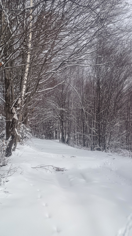 Poteca merge în general pe muchie și, așa cum remarcăm cu toții au cam dispărut urmele de oameni. Sunt doar urme de animale, în mare majoritate de cîini. Așadar trebuie să ne mai așteptăm la întîlniri. Și așa a și fost. Am fost lătrați și atacați de cînii aflați la gospodăriile din apropierea drumului, ba, mai mult, și de cîini aflați la casele de pe versantul opus. Aceștia din urmă s-au mobilizat exemplar, au coborît pînă în vale și apoi au urcat tot versantul pe care ne găseam noi. Prin diverse metode am reușit să îi ținem departe.