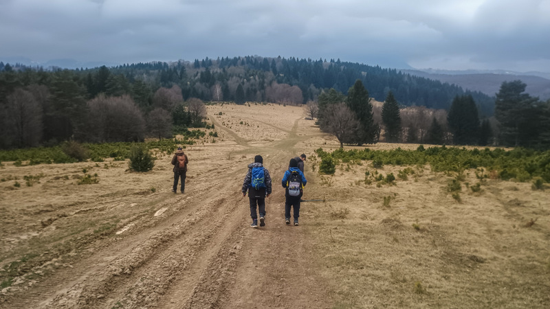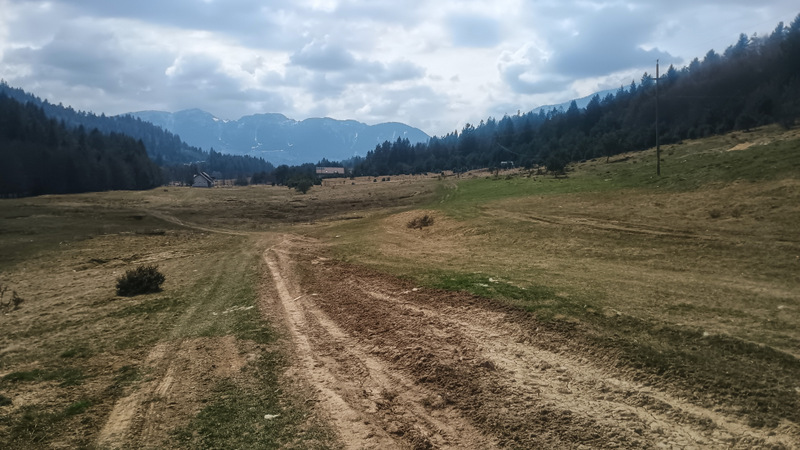 Noi ținem drumul principal. Din ce se pare avem de urcat un deal, sunt două posibilități. Noi ținem varianta ce pare mai prietenoasă. Pînă la urmă intrăm iar în pădure și începem să urcăm abrupt. Dar nu pentru mult timp. Ieșim pe un platou frumos, înierbat, care ocupă o suprafață mare. Din nefericire, munții din jur sunt în nori, altfel cu siguranță am fi avut niște peisaje pe cinste.