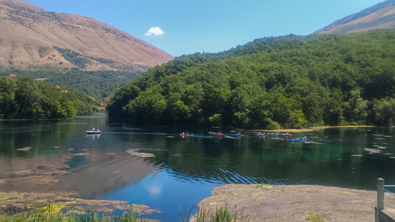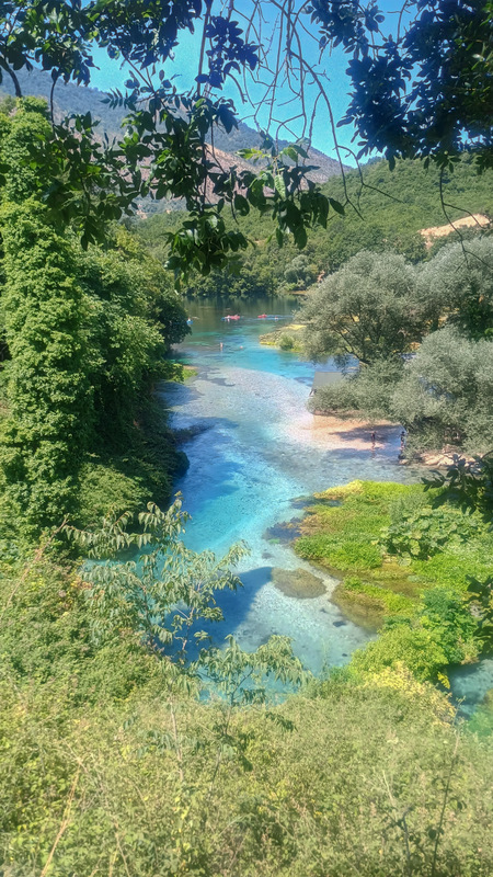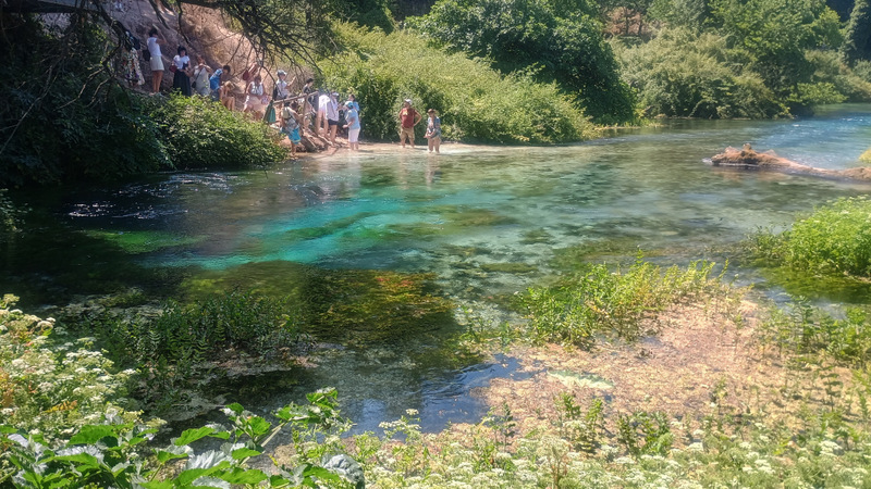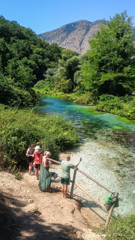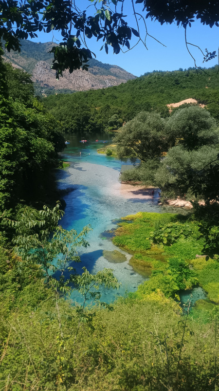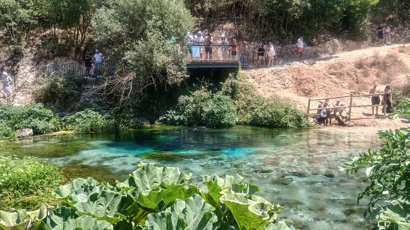 Plecăm de la locul de cazare spre Rezervația Ochiul Albastru. Din fericire suntem la margine de oraș ieșim rapid și mergem cam 40 de km pe un drum perfect. Începem să urcăm într-o zonă muntoasă. Curînd ajungem la o parcare imensă.