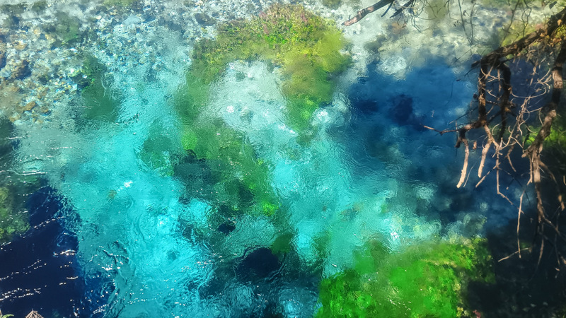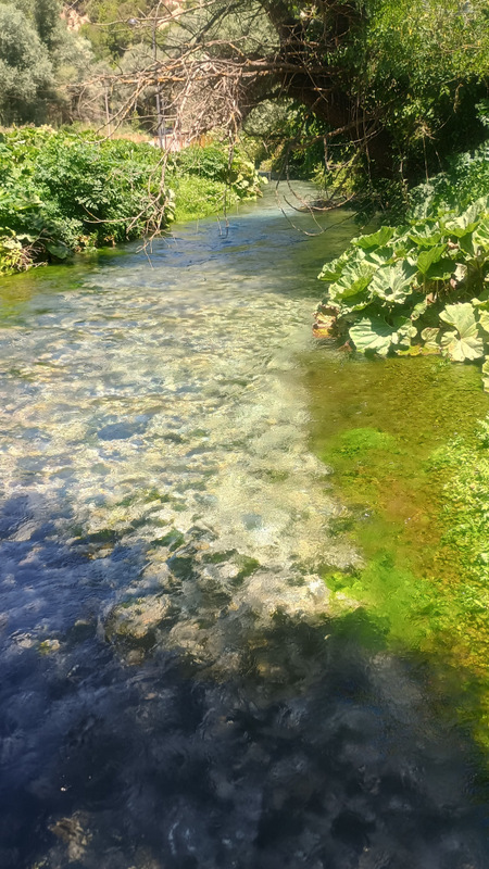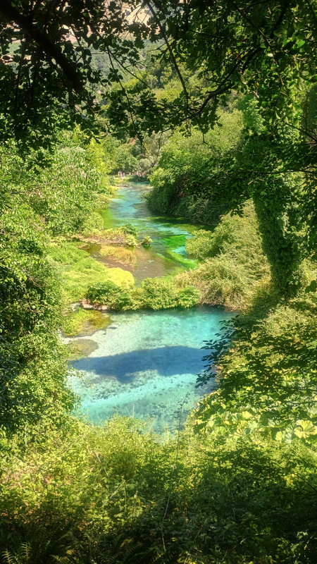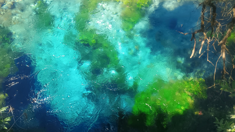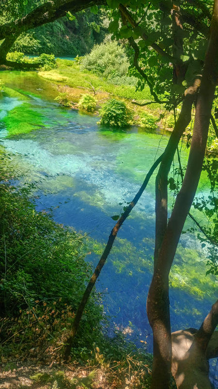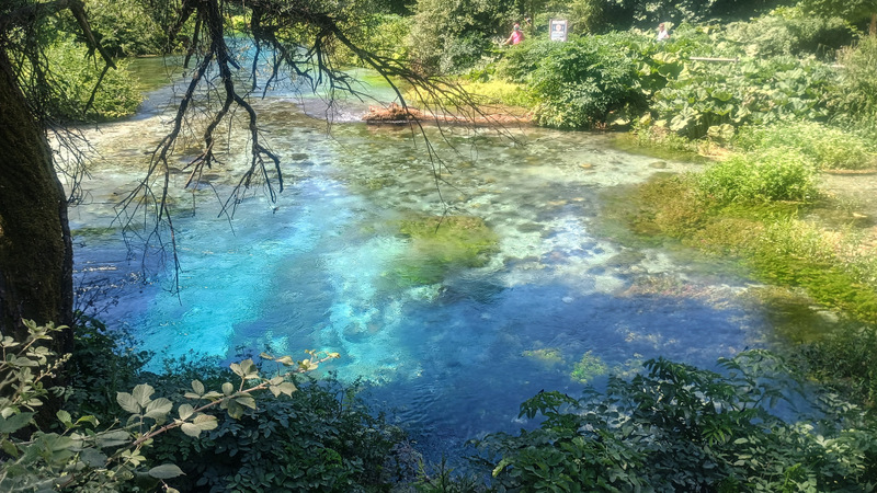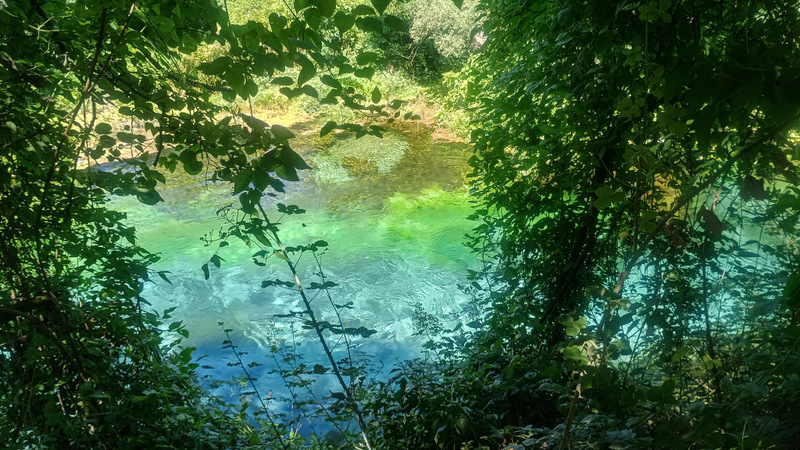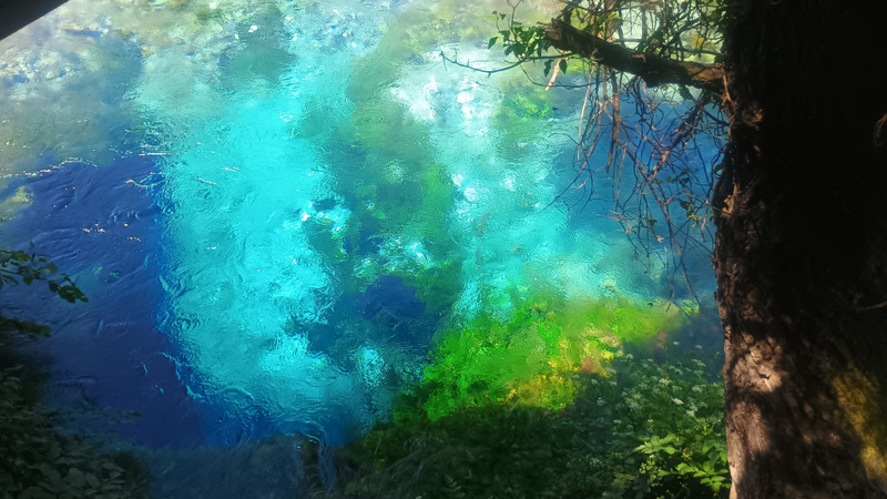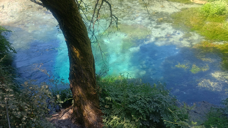 Coborîm trecem un pîrîu nervos și amenajat. În cîteva minute ajungem la Ochiul Albastru. Dar hai să explicăm puțin fenomenul.