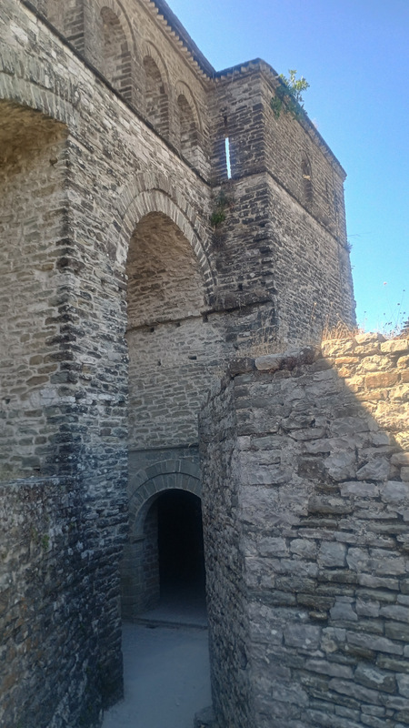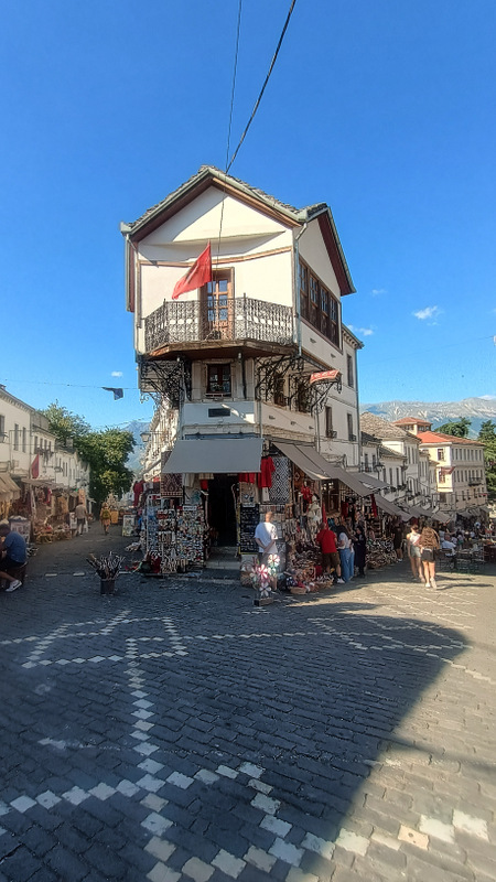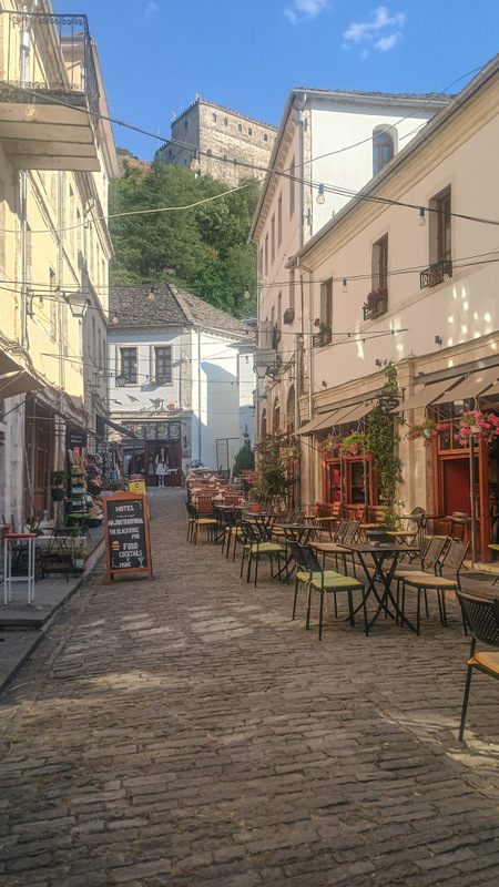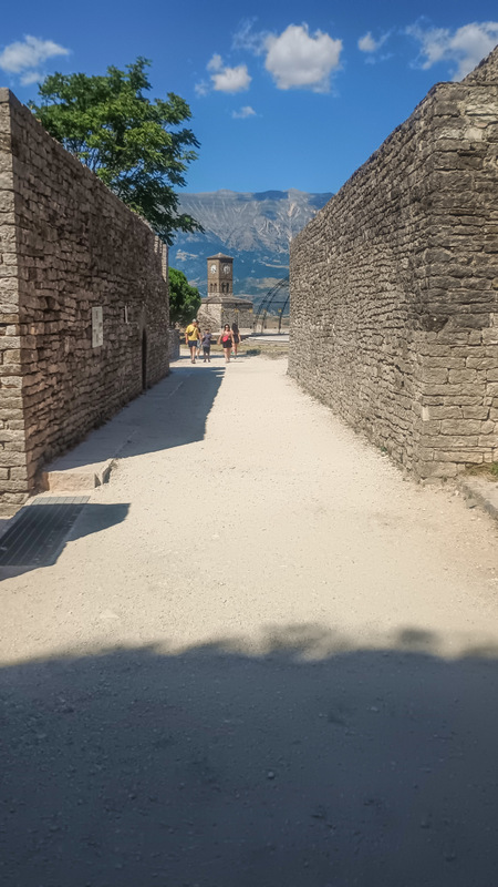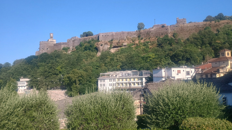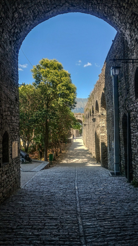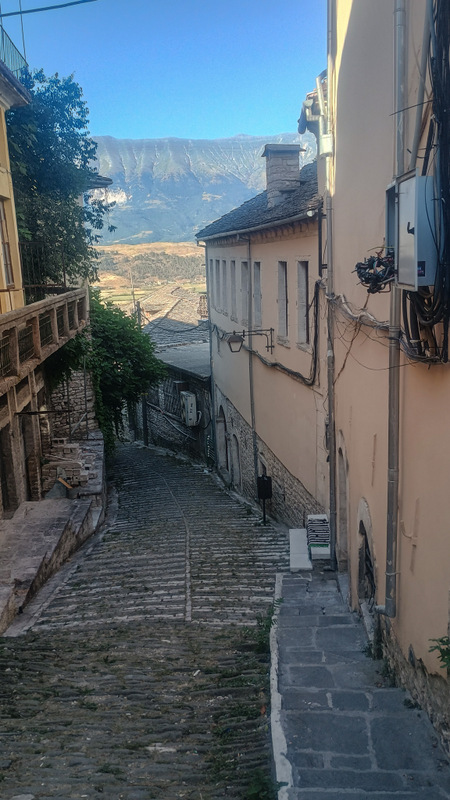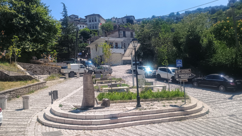 La una din aceste intersecții era o stradă în pantă mare pavată cu piatră fasonată. Am crezut că e un pietonal. Polițistul m-a îndemnat să urc cu mașina. Mi se părea imposibil. Dar am reușit și am ajuns aproape de castel. Ba mai mult am găsit și loc de parcare gratuit și la umbră, în zona hotelului Gjirokastra.