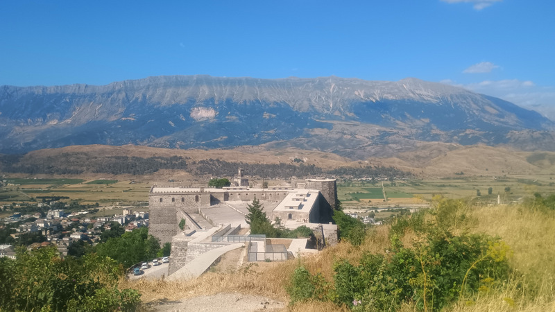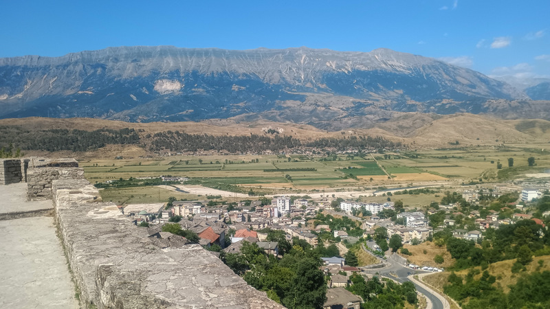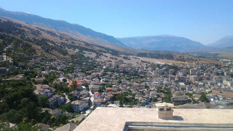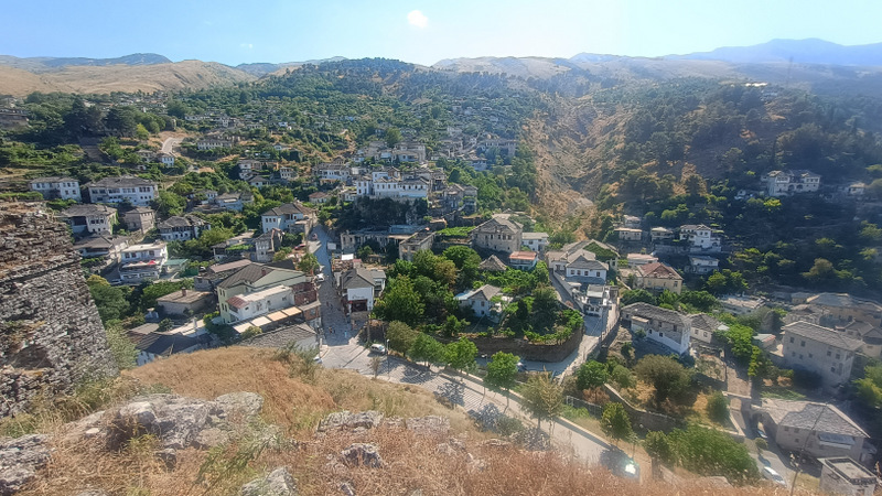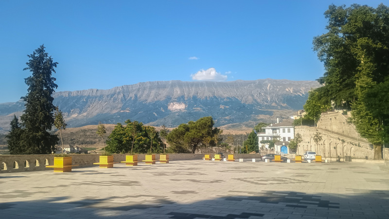 Și plecăm pe un drum de munte spre orașul Gjirokaster. Drumul este impecabil și urcă pînă într-un pas numit Qafa Muzines, aflat la aproape 600 de metri altitudine. De aici e de coborît într-o vale largă. Pe partea cealaltă sunt alți munți stîncoși și goi.