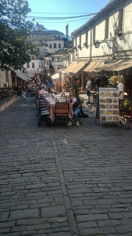 Ieșim din castel și mergem în zona vechiului bazar. Zona este relativ restrînsă, sunt cîteva străzi cu magazinașe de tot felul. Alegem un restaurant că după atîta umblătură ni se făcuse foame. Și astfel facem cunoștință cu preparatele albaneze, nu foarte diferite de ceea ce găsim și la noi.