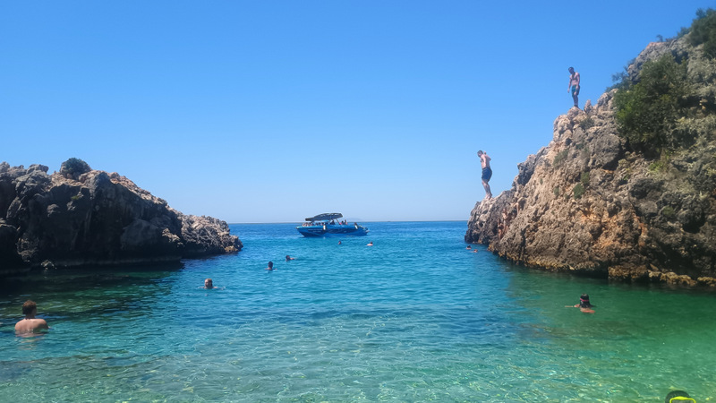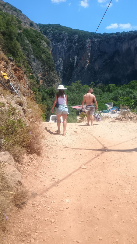 În fine, ne găsim și noi un loc pe plajă lîngă o platformă din bidoane. Copiii sunt fericiți că pot sări în apă nestingheriți. După o primă baie, merg cu gîndul să văd intrarea în canion. Există o potecă nemarcată și din cîte am înțeles există și locuri de cățărat.