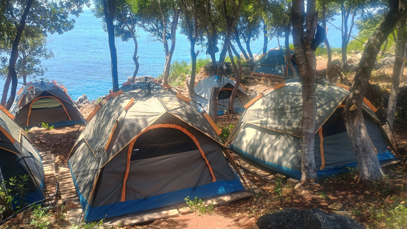 La un moment dat mă duc să văd cum e treaba cu campingul. S-a dovedit a fi ceva extrem de simplu: în pădure, la umbră, sunt montate vreo 10 corturi. Plătești și poți sta acolo. Undeva la margine există toalete și duș, ambele cît se poate de simple. Construit din OSB și adus apă acolo.