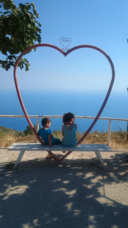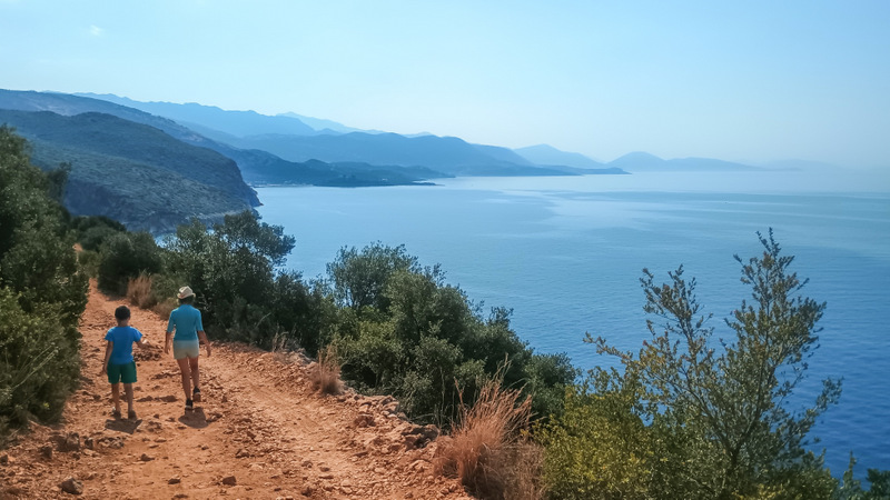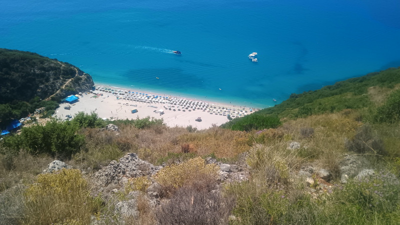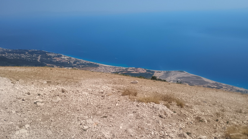 Din fericire fiind aproape de mare mai prindem briza, iar drumul are cîteva puncte de belvedere foarte frumoase. La început e de urcat. Ajungem sus, cumva în paralel cu lunga plajă Livadhi. De sus pare frumoasă, cu ape colorate parcă de un artist.