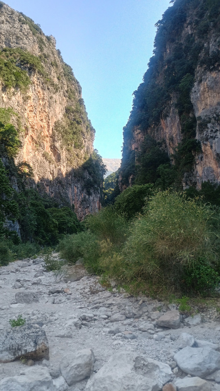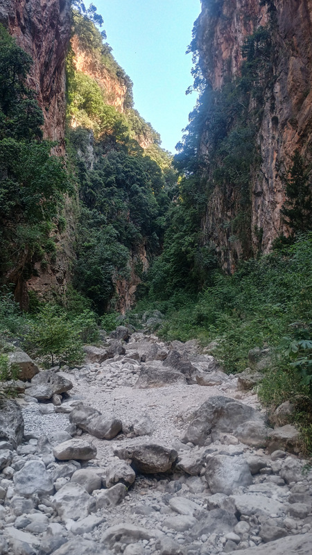 Deocamdată merg singur. Pereții sunt înalți, cam la 100 de metri față de fundul văii. Și trepta, se apropie unul de celălalt. În canion, e umbră, e răcoare de binelea. Iar liniștea este întreruptă uneori doar de țipătul păsărilor de pradă. Poteca e plăcută, plină de bolovani de toate formele și dimensiunile. Cînd plouă e clar că pe aici curge un pîrîu care ajunge în mare. Merg în canion pînă undeva unde nu se mai poate înainta. Este o săritoare prevăzută cu o frînghie. Piatra e foarte netedă și alunecoasă. Cert e că nici eu nu am fost prea insistent.