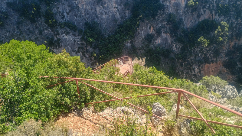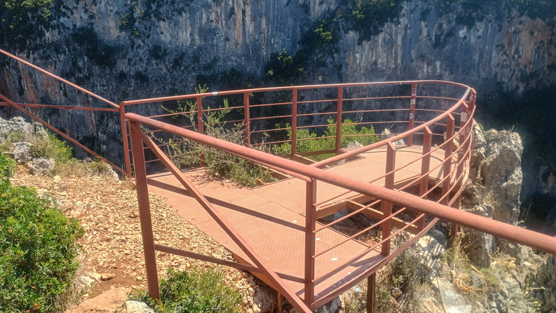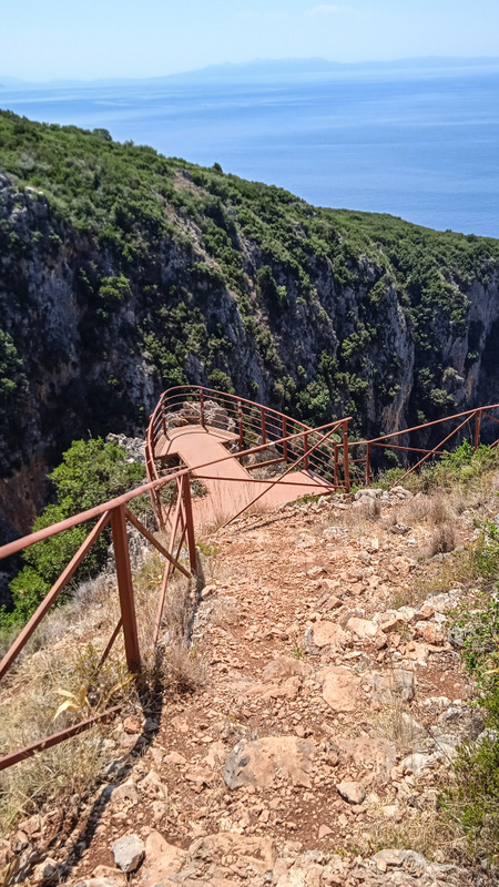 In fine, îmi văd de drum. Urmează o parte mai puțin spectaculoasă. Mă depărtez de pereții canionului, merg printre arbuști. Undeva există un indicator pe care scrie Panoramic. În câteva minute sunt la marginea unei stânci. De aici se coboară pînă la un fel de balcon aflat deasupra hăului și făcut din fier. Ei bine aici e copleșitor. Vezi și plaja și canionul și muntele înalt din spate.