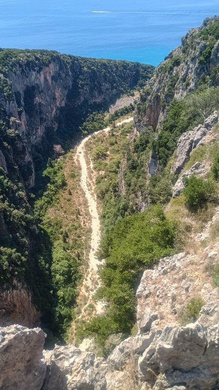 Coborîm spre Dhermi. Oprim la intersecția cu un drum de piatră. Mergem pe el o bucată că pare și este spectaculos. Drumul traversează pe sus o vale și merge de-a coasta pe versantul opus. E aerian, e fain..dar căldura ne doboară și revenim la mașină.