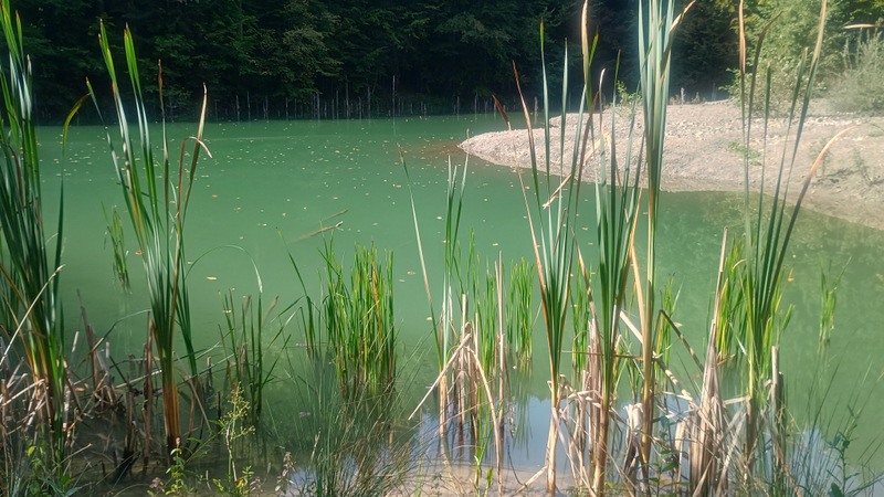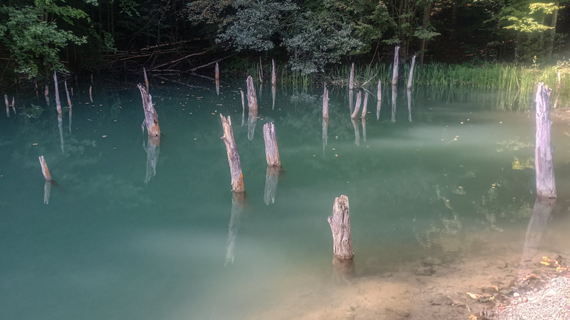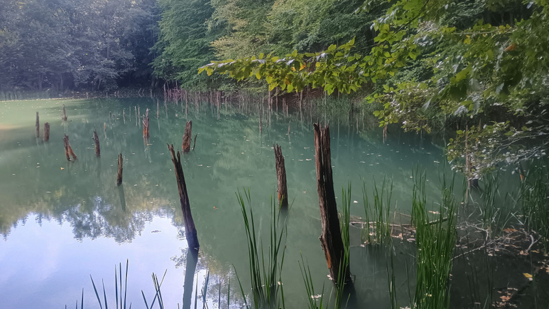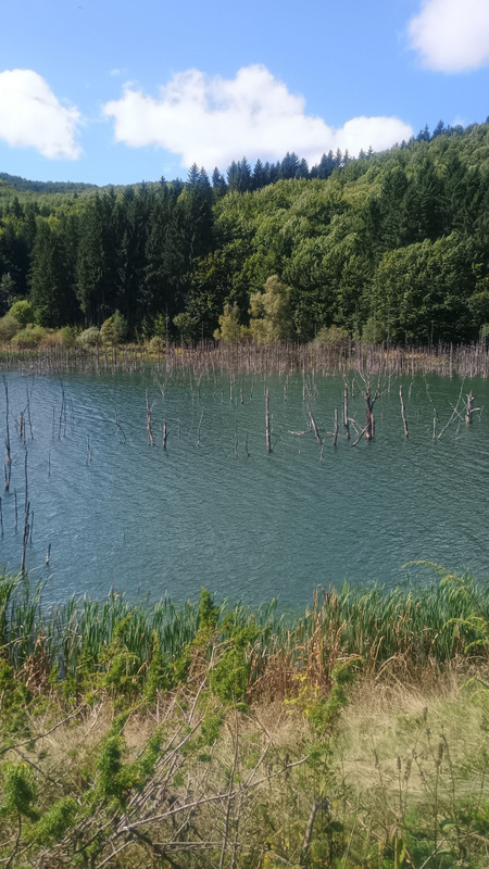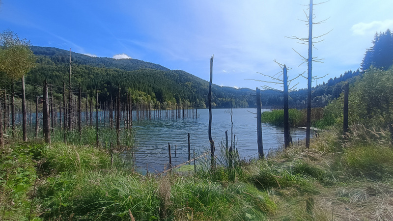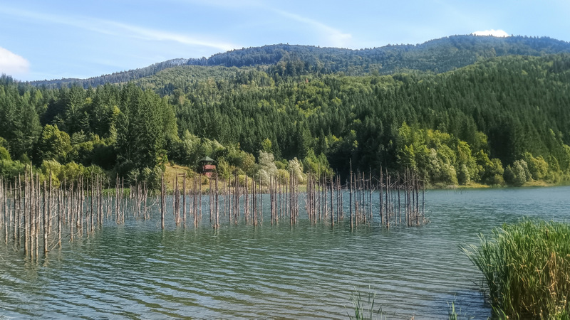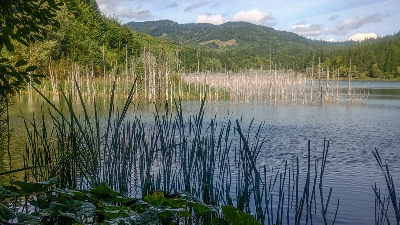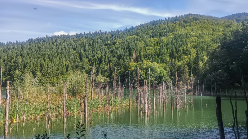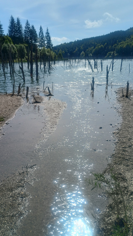 O mulțime de trunchiuri de copac se văd ieșind din apă. Suprafața lacului este mare, de unde suntem nu se vede prea bine unde se termină. Cum stăm noi și ne uităm la lac trebuie luată o decizie: pe care mal să ne ducem. Și, profitînd de experiența domnului Stoica, alegem malul vestic.