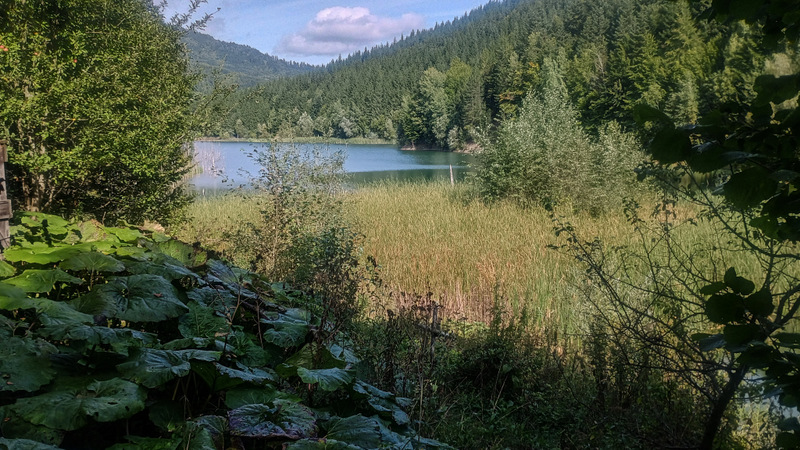 De aici continuarea nu mai e chiar evidentă, dar undeva în coada lacului Cuejdel 2 dibuim o potecuță. Urmează o porțiune scurtă de urcare abruptă care ne scoate în final pe malul sudic Lacului Cuejdel.