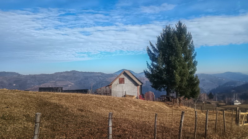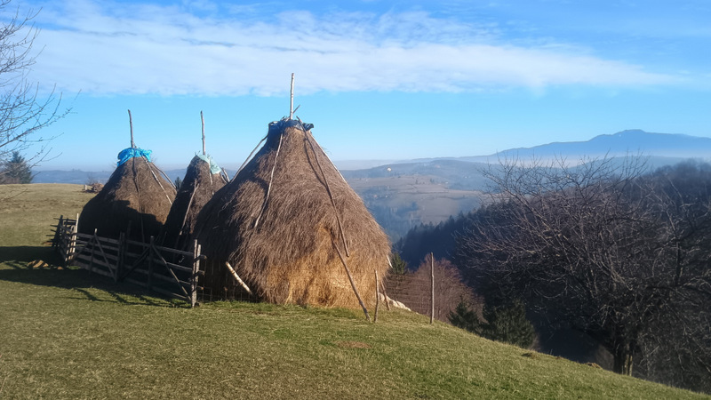 Peisajul se tot deschide, e toamnă tîrzie și plăcută. Pe la gospodării e liniște, animalele ne privesc curioase. Admirăm și cîteva construcții noi care se încadrează bine în peisaj. Undeva relativ aproape de culmea dealului facem o pauză de masă, copilele au poftă de mîncare.